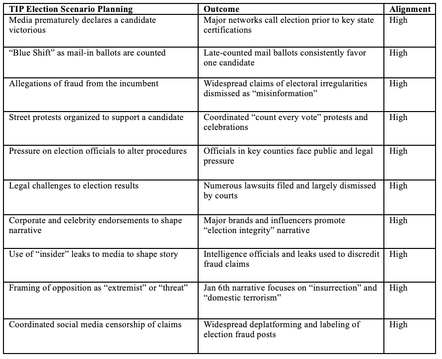 This made TIP the political counterpart to Event 201. The pandemic created the conditions for electoral confusion; TIP provided the battle plan to control the outcome. Real-world events media’s unified election call, censorship of electoral integrity claims, and the response to January 6th directly echoed TIP’s playbook.