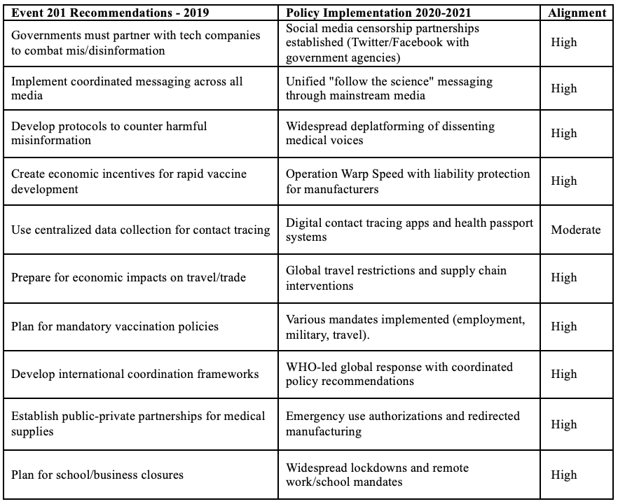 Critically, the exercise focused less on medical solutions and more on managing information (”combating misinformation”) and implementing public-private governance structures. The policies wargamed during Event 2019 bear a striking resemblance to those later implemented globally.