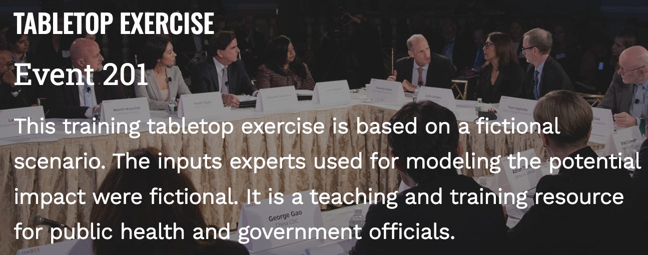 On October 18, 2019, the Johns Hopkins Center for Health Security, in partnership with the World Economic Forum and the Bill & Melinda Gates Foundation, conducted a high-level tabletop exercise simulating a global coronavirus pandemic (Center for Health Security, 2019). The fictional “CAPS” coronavirus scenario closely mirrored the future SARS-CoV-2 pandemic in etiology and global impact.